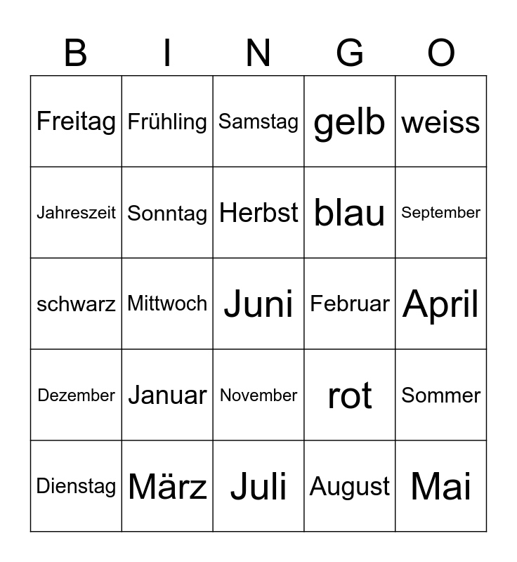 This bingo card has a free space and 29 words: Dienstag, Montag, Mittwoch, Donnerstag, Freitag, Samstag, Sonntag, Januar, Februar, März, April, Mai, Juli, August, September, Oktober, November, Dezember, weiss, schwarz, rot, grün, blau, Jahreszeit, gelb, Frühling, Sommer, Herbst and Winter.