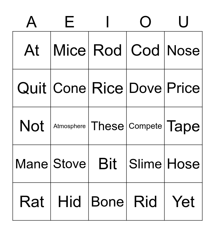 This bingo card has 128 words: Free!, At, Ate, Bake, Bat, Can, Cane, Cap, Cape, Car, Care, Cat, Fad, Fade, Fat, Fate, Hat, Hate, Mad, Made, Man, Mane, Mat, Mate, Plan, Plane, Rat, Rate, Sat, Tap, Tape, Atmosphere, Bed, Compete, Complete, Hen, Her, Here, Met, Net, Obese, Peg, Pet, Pete, Red, Sphere, Supreme, These, Yes, Yet, Bike, Bit, Bite, Dice, Dim, Dime, Fin, Fine, Fish, Five, Hid, Hide, Ice, Kit, Kite, Mice, Nine, Pine, Price, Quit, Quite, Rice, Rid, Ride, Slid, Slide, Slim, Slime, Tim, Time, Bone, Cod, Code, Con, Cone, Dog, Dove, Drove, Fox, Froze, Hop, Hope, Hose, Hot, Job, Log, Mop, Nose, Not, Note, Rod, Rode, Rose, Stone, Stove, Those, Ton, Tone, Vote, Wrote, Bug, But, Cub, Cube, Cut, Cute, Dune, Fun, Fuse, Hug, Huge, Mud, Mule, Mute, Run, Tub, Tube and Tune.