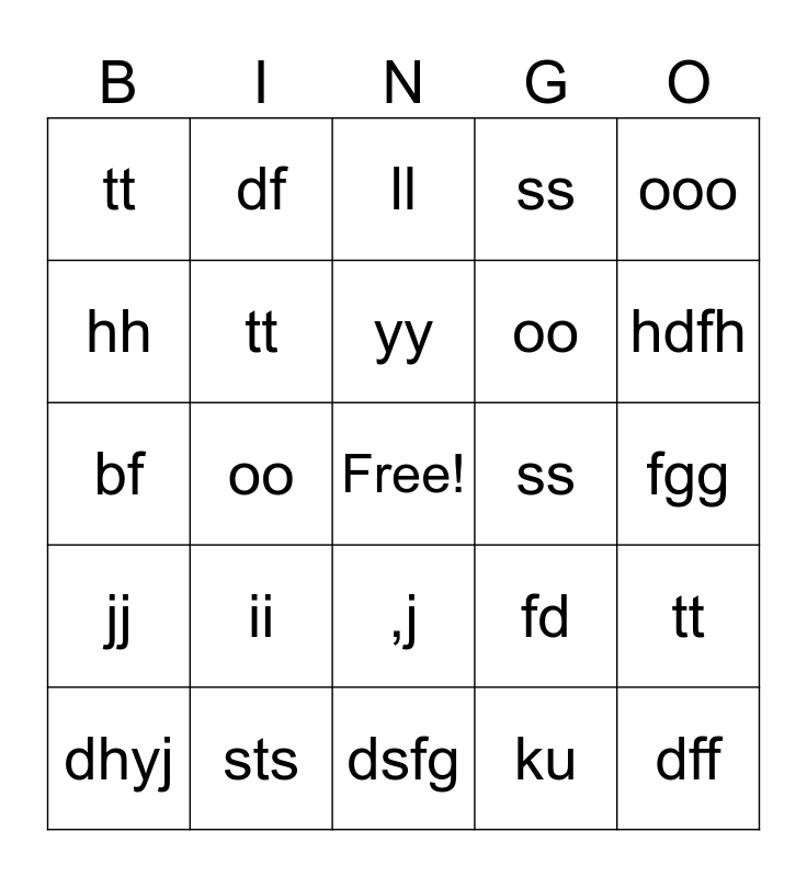 This bingo card has a free space and 38 words: qq, ee, rr, tt, tt, ii, yy, uu, ooo, oo, oo, ss, dff, fgg, hh, jj, kk, ll, ll, ss, tt, sts, hdfh, dhyj, ngf, dsfg, mjh, fdf, wsed, fdsb, kj, ,j, ku, df, fr, fd, bf and kæio.