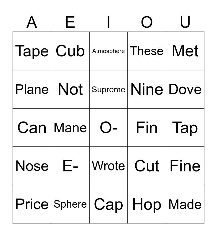 This bingo card has 133 words: Free!, A-, At, Ate, Bake, Bat, Can, Cane, Cap, Cape, Car, Care, Cat, Fad, Fade, Fat, Fate, Hat, Hate, Mad, Made, Man, Mane, Mat, Mate, Plan, Plane, Rat, Rate, Sat, Tap, Tape, E-, Atmosphere, Bed, Compete, Complete, Hen, Her, Here, Met, Net, Obese, Peg, Pet, Pete, Red, Sphere, Supreme, These, Yes, Yet, I-, Bike, Bit, Bite, Dice, Dim, Dime, Fin, Fine, Fish, Five, Hid, Hide, Ice, Kit, Kite, Mice, Nine, Pine, Price, Quit, Quite, Rice, Rid, Ride, Slid, Slide, Slim, Slime, Tim, Time, O-, Bone, Cod, Code, Con, Cone, Dog, Dove, Drove, Fox, Froze, Hop, Hope, Hose, Hot, Job, Log, Mop, Nose, Not, Note, Rod, Rode, Rose, Stone, Stove, Those, Ton, Tone, Vote, Wrote, U-, Bug, But, Cub, Cube, Cut, Cute, Dune, Fun, Fuse, Hug, Huge, Mud, Mule, Mute, Run, Tub, Tube and Tune.