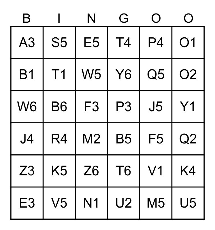This bingo card has 144 words: C6, D2, P1, Q3, M5, J4, B2, V6, L2, G1, Y2, W3, G3, A1, J3, I6, N1, C1, X1, I2, H6, R4, D5, E4, E6, O2, S5, B3, K2, H4, Z6, A4, T5, F3, U5, F1, K6, U1, W5, R5, G5, U3, Y1, O3, Y4, N4, S6, X2, P5, H2, W2, E2, M2, J6, L4, K3, V4, L1, I5, M3, Z3, Q2, S2, H3, T2, P3, R1, Z2, O6, G6, V5, A3, Q5, J2, A6, E1, Z5, V1, T4, N3, I1, G4, D3, U2, Y6, M1, B6, A2, F5, L3, X4, L6, H5, B5, K1, R3, M4, I3, Z4, S4, O1, F2, C3, Y5, T1, P6, N2, G2, C4, B1, A5, E5, R2, P4, W6, P2, J1, E3, C2, V3, X6, F4, D1, L5, Q4, W1, Y3, K5, H1, D6, T3, X3, B4, O4, S3, Q1, V2, Z1, K4, J5, T6, C5, W4 and R6.
