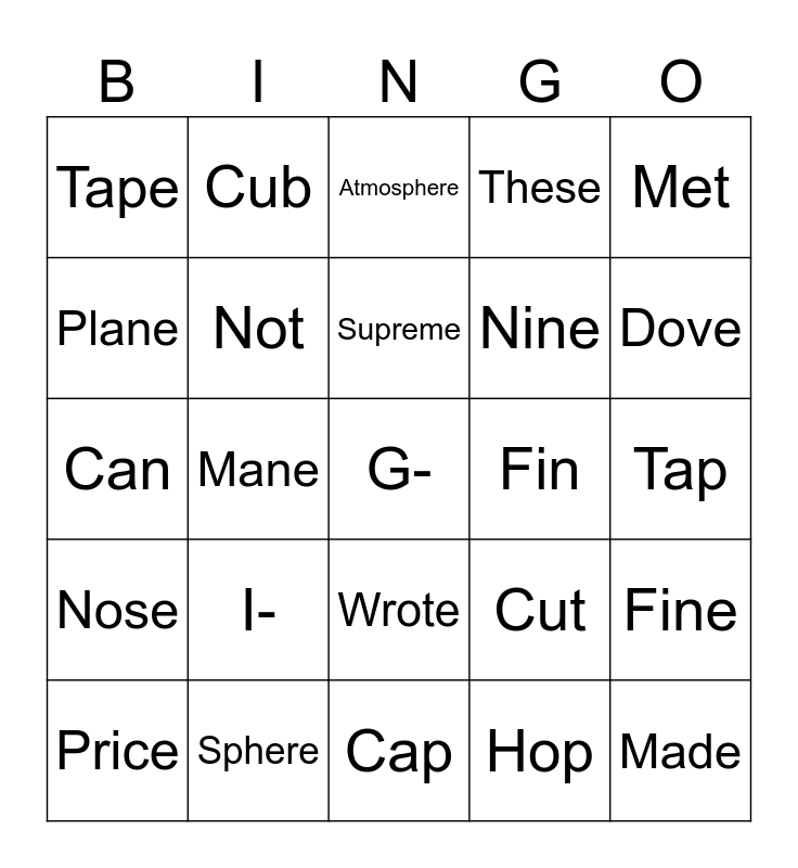 This bingo card has 133 words: Free!, B-, At, Ate, Bake, Bat, Can, Cane, Cap, Cape, Car, Care, Cat, Fad, Fade, Fat, Fate, Hat, Hate, Mad, Made, Man, Mane, Mat, Mate, Plan, Plane, Rat, Rate, Sat, Tap, Tape, I-, Atmosphere, Bed, Compete, Complete, Hen, Her, Here, Met, Net, Obese, Peg, Pet, Pete, Red, Sphere, Supreme, These, Yes, Yet, N-, Bike, Bit, Bite, Dice, Dim, Dime, Fin, Fine, Fish, Five, Hid, Hide, Ice, Kit, Kite, Mice, Nine, Pine, Price, Quit, Quite, Rice, Rid, Ride, Slid, Slide, Slim, Slime, Tim, Time, G-, Bone, Cod, Code, Con, Cone, Dog, Dove, Drove, Fox, Froze, Hop, Hope, Hose, Hot, Job, Log, Mop, Nose, Not, Note, Rod, Rode, Rose, Stone, Stove, Those, Ton, Tone, Vote, Wrote, O-, Bug, But, Cub, Cube, Cut, Cute, Dune, Fun, Fuse, Hug, Huge, Mud, Mule, Mute, Run, Tub, Tube and Tune.