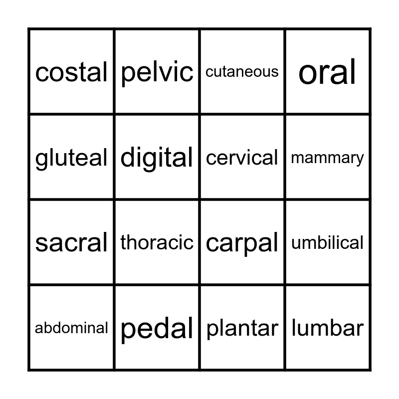 This bingo card has 32 words: cranial, brachial, umbilical, tarsal, lumbar, cervical, gluteal, orbital, pelvic, popliteal, mammary, cutaneous, palmar, inguinal, pedal, femoral, buccal, carpal, axillary, nasal, occipital, pectoral, plantar, frontal, abdominal, oral, sacral, digital, costal, patella, crural and thoracic.