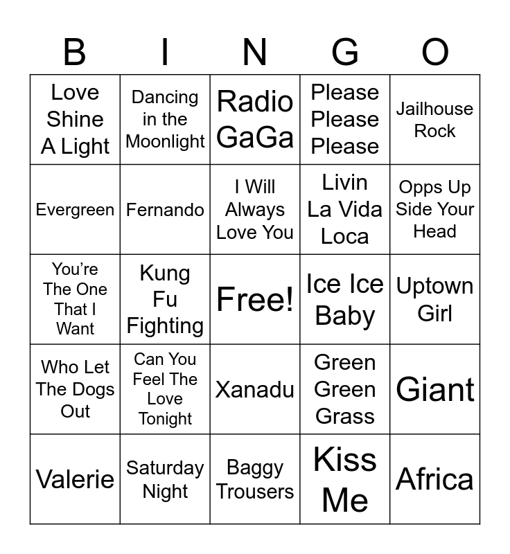 This bingo card has a free space and 52 words: Agadoo, Africa, Baby One More Time, Baggy Trousers, Can You Feel The Love Tonight, Chain Reaction, Dancing in the Moonlight, Dancing Queen, Evergreen, Everlasting Love, Fernando, Firework, Giant, Green Green Grass, Hello, Happy, I Will Always Love You, Ice Ice Baby, Jump, Jailhouse Rock, Kung Fu Fighting, Kiss Me, Love Shine A Light, Livin La Vida Loca, Mmmbop, My Life Would Suck Without You, November Rain, Never Gonna Give You Up, Opps Up Side Your Head, One Love, Party in the USA, Please Please Please, Quit Playing Games With My Heart, Queen of My Heart, Reach, Radio GaGa, Saturday Night, Sweet Caroline, Try Everything, Texas Hold ‘Em, Under Pressure, Uptown Girl, Who Let The Dogs Out, Wannabe, Xanadu, XO, Yellow Submarine, You’re The One That I Want, Zombie, Zero To Hero, Valerie and Video Killed The Radio Star.