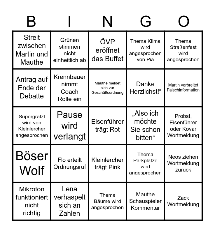 This bingo card has 25 words: Flo erteilt Ordnungsruf, Thema Bäume wird angesprochen, Mauthe meldet sich zur Geschäftsordnung, Mikrofon funktioniert nicht richtig, Thema Straßenfest wird angesprochen, Streit zwischen Martin und Mauthe, Antrag auf Ende der Debatte, Grünen stimmen nicht einheitlich ab, „Also ich möchte Sie schon bitten“, Kleinlercher trägt Pink, Danke Herzlichst!“, Supergrätzl wird von Kleinlercher angesprochen, Thema Parkplätze wird angesprochen, Neos ziehen Wortmeldung zurück, Krennbauer nimmt Coach Rolle ein, Zack Wortmeldung, Probst, Eisenführer oder Kovar Wortmeldung, ÖVP eröffnet das Buffet, Martin verbreitet Falschinformation, Pause wird verlangt, Eisenführer trägt Rot, Lena verhaspelt sich an Zahlen, Böser Wolf, Thema Klima wird angesprochen von Pia and Mauthe Schauspieler Kommentar.