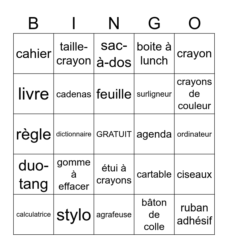 This bingo card has a free space and 24 words: gomme à effacer, stylo, feuille, calculatrice, crayon, cahier, livre, taille-crayon, agenda, étui à crayons, surligneur, règle, cartable, ciseaux, cadenas, bâton de colle, ordinateur, sac-à-dos, crayons de couleur, dictionnaire, ruban adhésif, duo-tang, boite à lunch and agrafeuse.