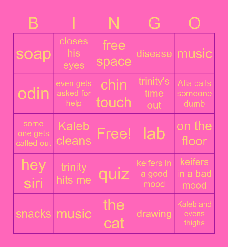 This bingo card has a free space and 24 words: trinity hits me, music, chin touch, snacks, music, soap, odin, closes his eyes, lab, quiz, trinity's time out, some one gets called out, keifers in a good mood, keifers in a bad mood, even gets asked for help, drawing, on the floor, free space, Alia calls someone dumb, Kaleb cleans, Kaleb and evens thighs, hey siri, disease and the cat.