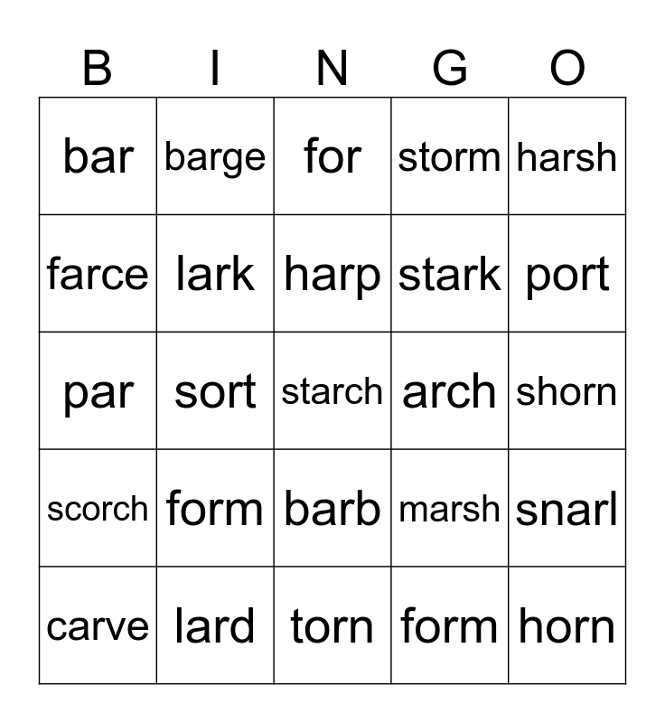 This bingo card has a free space and 24 words: form, lard, harp, carve, harsh, bar, farce, barge, arch, barb, stark, par, marsh, snarl, lark, form, shorn, for, port, sort, horn, scorch, storm and torn.