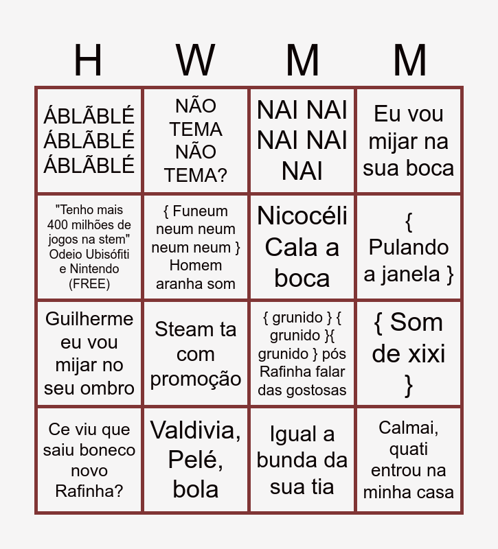 This bingo card has 16 words: Valdivia, Pelé, bola, { Som de xixi }, NAI NAI NAI NAI NAI, ÁBLÃBLÉ ÁBLÃBLÉ ÁBLÃBLÉ, Guilherme eu vou mijar no seu ombro, NÃO TEMA NÃO TEMA?, { grunido } { grunido }{ grunido } pós Rafinha falar das gostosas, Igual a bunda da sua tia, "Tenho mais 400 milhões de jogos na stem" Odeio Ubisófiti e Nintendo (FREE), { Funeum neum neum neum neum } Homem aranha som, Ce viu que saiu boneco novo Rafinha?, Eu vou mijar na sua boca, Steam ta com promoção, { Pulando a janela }, Nicocéli Cala a boca and Calmai, quati entrou na minha casa.