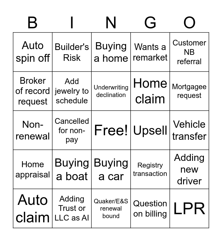 This bingo card has a free space and 24 words: Buying a boat, Adding Trust or LLC as AI, Underwriting declination, Auto claim, Customer NB referral, Auto spin off, Broker of record request, Builder's Risk, Upsell, Buying a car, Home claim, Non-renewal, Registry transaction, Adding new driver, Add jewelry to schedule, Question on billing, Vehicle transfer, Buying a home, Mortgagee request, Cancelled for non-pay, LPR, Home appraisal, Wants a remarket and Quaker/E&S renewal bound.