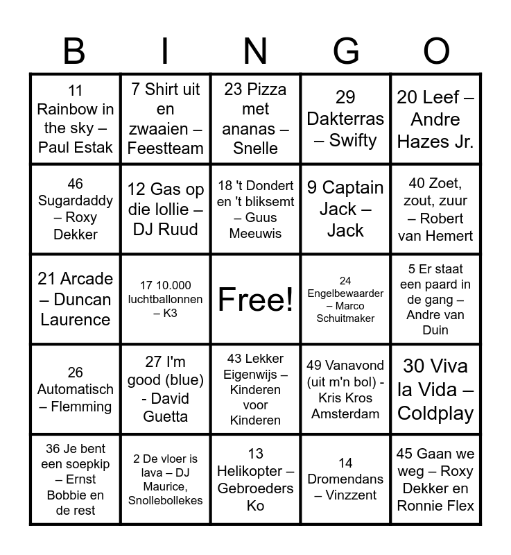 This bingo card has a free space and 50 words: 1 Atje voor de sfeer – Rene Karst, 2 De vloer is lava – DJ Maurice, Snollebollekes, 3 Links Rechts – Snollebollekes, 4 Feesttent – Kraantje Pappie, 5 Er staat een paard in de gang – Andre van Duin, 6 Hallo allemaal – Gebroeders Rossig, 7 Shirt uit en zwaaien – Feestteam, 8 Jij krijgt die lach niet van mijn gezicht – John de Bever, 9 Captain Jack – Jack, 10 Cowboys en Indianen – Dikdakkers, 11 Rainbow in the sky – Paul Estak, 12 Gas op die lollie – DJ Ruud, 13 Helikopter – Gebroeders Ko, 14 Dromendans – Vinzzent, 15 Toeter op m'n waterscooter – Gebroeders Ko, 16 De kabouterdans – Kabouter Plop, 17 10.000 luchtballonnen – K3, 18 't Dondert en 't bliksemt – Guus Meeuwis, 19 Schatje mag ik je foto – Gebroeders Ko, 20 Leef – Andre Hazes Jr., 21 Arcade – Duncan Laurence, 22 Break my heart - Rondé, 23 Pizza met ananas – Snelle, 24 Engelbewaarder – Marco Schuitmaker, 25 Hotelschool – Antoon, 26 Automatisch – Flemming, 27 I'm good (blue) - David Guetta, 28 Vreemde eend – Lisanne Dijkstra, 29 Dakterras – Swifty, 30 Viva la Vida – Coldplay, 31 Je blik richting mij – Bankzitters, 32 Blauwe dag – Suzan en Freek, 33 Anne-Fleur vakantie – Roxy Dekker, 34 Twee motten – Gerard Joling, 35 99 luftballons – Nena, 36 Je bent een soepkip – Ernst Bobbie en de rest, 37 Europapa – Joost Klein, 38 Noodgeval – Goldband, 39 Terug in de tijd – Yves Berendse, 40 Zoet, zout, zuur – Robert van Hemert, 41 Huisfeestje – Roxy Dekker en de Bankzitters, 42 Avond4daagse – Kinderen voor Kinderen, 43 Lekker Eigenwijs – Kinderen voor Kinderen, 44 Luchtballon – Joost Klein, 45 Gaan we weg – Roxy Dekker en Ronnie Flex, 46 Sugardaddy – Roxy Dekker, 47 Entourage – De Bankzitters, 48 Cupido – De Bankzitters, 49 Vanavond (uit m'n bol) - Kris Kros Amsterdam and 50 Ik neem je mee – Gers Pardoel.