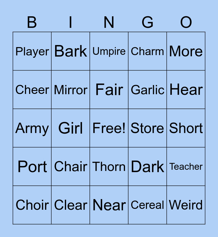 This bingo card has a free space and 29 words: Choir, Popcorn, Girl, Farm, Player, Umpire, Mirror, Chair, Store, Clear, Short, Weird, Near, Cereal, Hear, Disappear, Thorn, Port, More, Army, Dark, Yard, Garlic, Cheer, Charm, Bark, Teacher, Fair and Alarm.