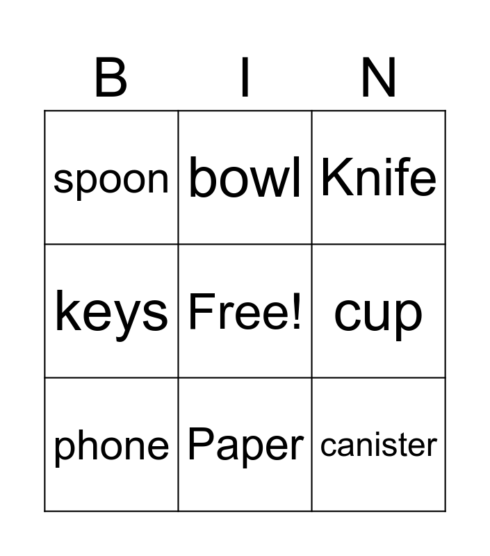 This bingo card has a free space and 8 words: cup, Knife, bowl, phone, spoon, canister, keys and Paper.