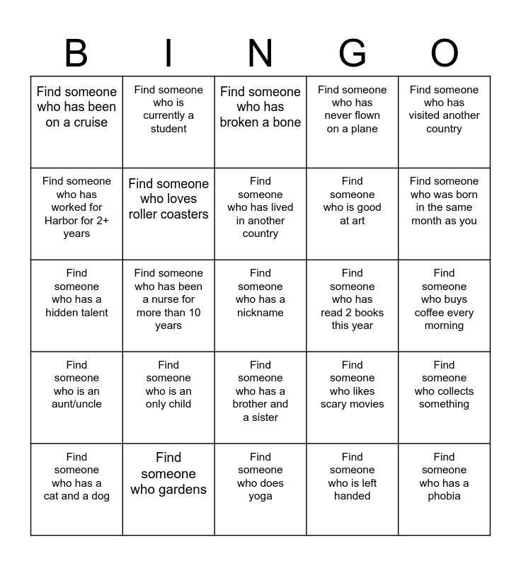 This bingo card has 25 words: Find someone who is an only child, Find someone who does yoga, Find someone who has lived in another country, Find someone who has a cat and a dog, Find someone who has visited another country, Find someone who has been on a cruise, Find someone who has worked for Harbor for 2+ years, Find someone who is currently a student, Find someone who has read 2 books this year, Find someone who has a brother and a sister, Find someone who is good at art, Find someone who has a hidden talent, Find someone who likes scary movies, Find someone who collects something, Find someone who loves roller coasters, Find someone who has a phobia, Find someone who buys coffee every morning, Find someone who has broken a bone, Find someone who was born in the same month as you, Find someone who has been a nurse for more than 10 years, Find someone who has a nickname, Find someone who gardens, Find someone who is an aunt/uncle, Find someone who has never flown on a plane and Find someone who is left handed.