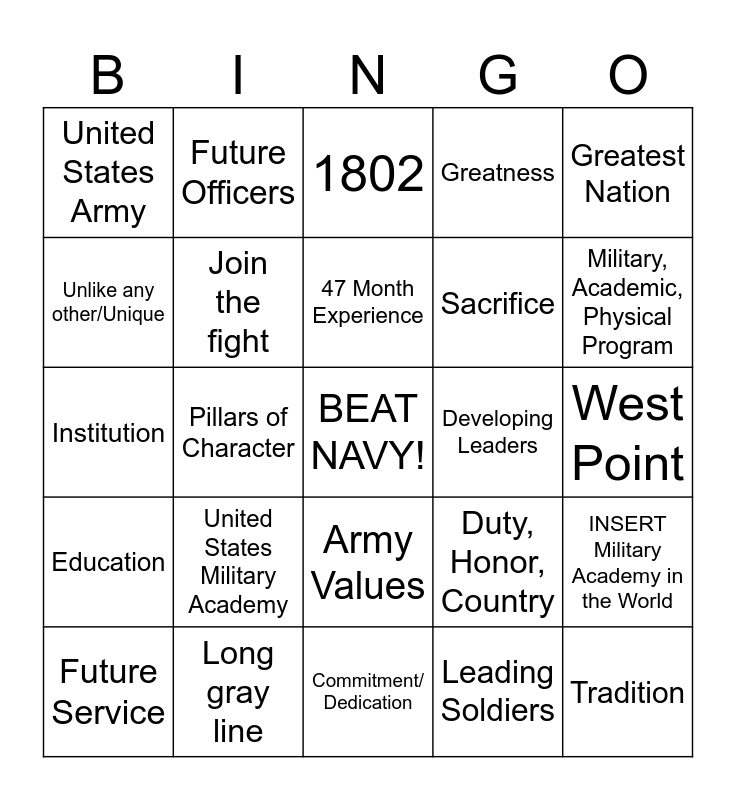 This bingo card has a free space and 24 words: United States Military Academy, Long gray line, 47 Month Experience, Future Service, Greatest Nation, United States Army, Unlike any other/Unique, Future Officers, Developing Leaders, Army Values, Sacrifice, Institution, Duty, Honor, Country, INSERT Military Academy in the World, Join the fight, Leading Soldiers, West Point, 1802, Military, Academic, Physical Program, Pillars of Character, Tradition, Education, Greatness and Commitment/ Dedication.