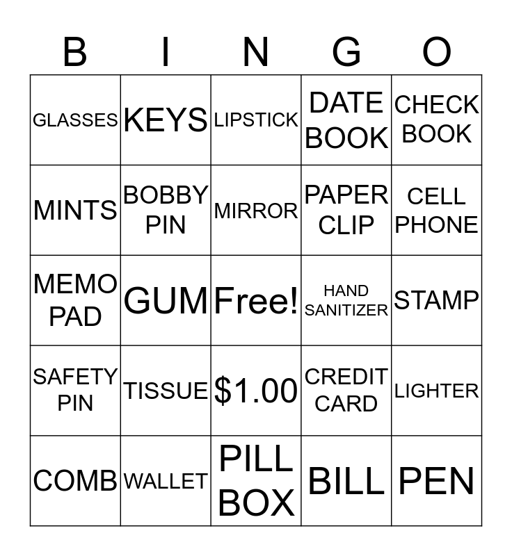 This bingo card has a free space and 24 words: TISSUE, WALLET, MIRROR, COMB, CHECK BOOK, GLASSES, MINTS, KEYS, HAND SANITIZER, $1.00, PAPER CLIP, MEMO PAD, CREDIT CARD, LIGHTER, BOBBY PIN, BILL, STAMP, LIPSTICK, CELL PHONE, GUM, PEN, SAFETY PIN, DATE BOOK and PILL BOX.