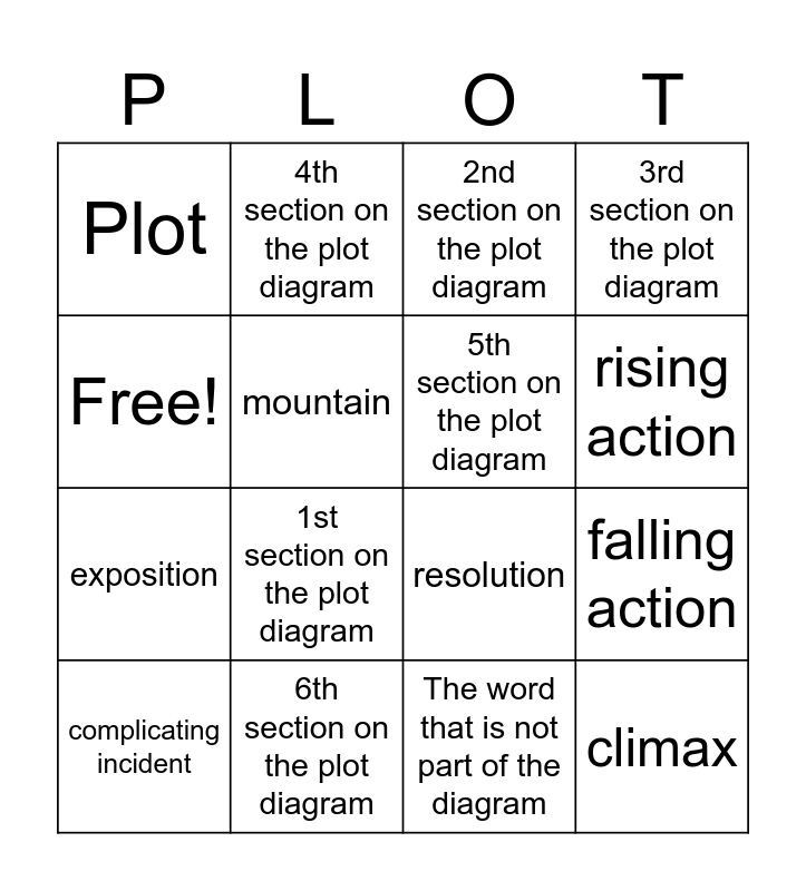 This bingo card has 16 words: 6th section on the plot diagram, falling action, 2nd section on the plot diagram, Plot, exposition, 4th section on the plot diagram, resolution, The word that is not part of the diagram, Free!, mountain, complicating incident, 3rd section on the plot diagram, 1st section on the plot diagram, rising action, 5th section on the plot diagram and climax.