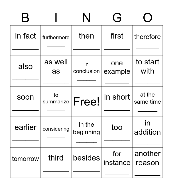 This bingo card has a free space and 52 words: another ______, another reason ______, another thought ______, besides ______, considering ______, equally important ______, furthermore ______, however ______, also ______, another example ______, as well as ______, for example ______, in addition ______, too ______, as a result ______, in brief ______, in conclusion ______, in short ______, in summary ______, therefore ______, to summarize ______, for instance ______, in fact ______, one example ______, to illustrate ______, again ______, finally ______, to begin with ______, to start with ______, after(ward) ______, before ______, first ______, later (on) ______, next ______, second ______, then ______, third ______, during ______, last ______, a long time ago ______, as soon as ______, at the same time ______, earlier ______, immediately ______, in the beginning ______, in the end ______, meanwhile ______, soon ______, the next day ______, today ______, tomorrow ______ and yesterday ______.
