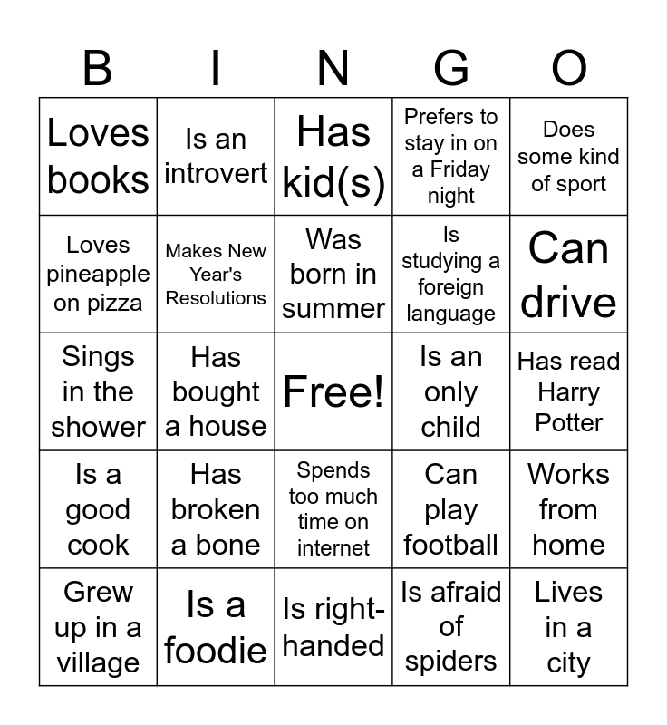 This bingo card has a free space and 24 words: Has broken a bone, Is a foodie, Was born in summer, Grew up in a village, Does some kind of sport, Loves books, Loves pineapple on pizza, Is an introvert, Is an only child, Spends too much time on internet, Is studying a foreign language, Sings in the shower, Can play football, Works from home, Makes New Year's Resolutions, Is afraid of spiders, Has read Harry Potter, Has kid(s), Can drive, Has bought a house, Lives in a city, Is a good cook, Prefers to stay in on a Friday night and Is right-handed.