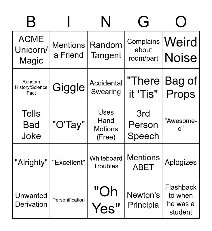This bingo card has a free space and 28 words: Aplogizes, Answers Own Question, "There it 'Tis", Newton's Principia, Random History/Science Fact, Random Tangent, Mentions a Friend, "Alrighty", 3rd Person Speech, Unwanted Derivation, Tells Bad Joke, Complains about room/part, Personification, "Oh Yes", Bag of Props, "Little" in weird voice, "Excellent", Giggle, Accidental Swearing, Whiteboard Troubles, ACME Unicorn/ Magic, Mentions the videos, Flashback to when he was a student, "O'Tay", "Awesome-o", Mentions ABET, Weird Noise and Mentions Pima.