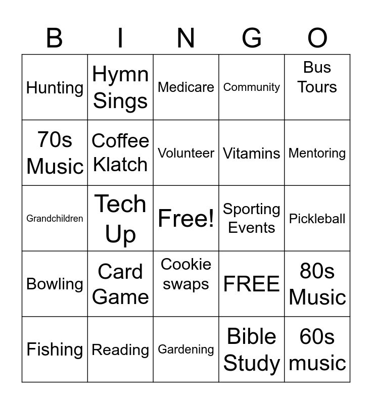 This bingo card has a free space and 25 words: Card Game, Gardening, Volunteer, Fishing, Bus Tours, Hunting, 70s Music, Hymn Sings, Sporting Events, Cookie swaps, Vitamins, Grandchildren, FREE, 80s Music, Coffee Klatch, Dream vacation, Pickleball, Medicare, Mentoring, Tech Up, 60s music, Reading, Bowling, Community and Bible Study.