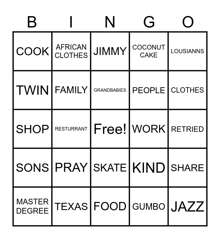 This bingo card has a free space and 24 words: MASTER DEGREE, PRAY, GRANDBABIES, GUMBO, LOUSIANNS, COOK, AFRICAN CLOTHES, JIMMY, WORK, RETRIED, SHOP, FAMILY, KIND, SHARE, TWIN, TEXAS, FOOD, COCONUT CAKE, CLOTHES, SONS, RESTURRANT, SKATE, PEOPLE and JAZZ.