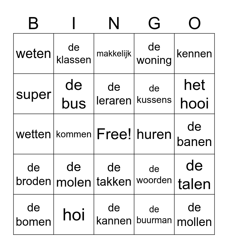This bingo card has a free space and 29 words: de bomen, de taken, kommen, komen, weten, makkelijk, de bus, de molen, huren, hoi, de banen, de mollen, de kannen, de buurman, het hooi, gemaakt, de takken, de broden, kennen, wetten, de woorden, de kamers, de kussens, super, de woning, de klassen, de talen, de leraren and de scholen.