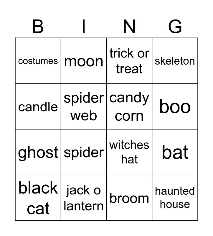 This bingo card has 16 words: jack o lantern, bat, trick or treat, costumes, ghost, moon, witches hat, broom, candle, spider web, black cat, skeleton, spider, boo, candy corn and haunted house.