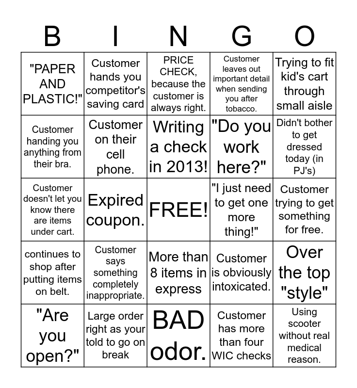 This bingo card has a free space and 38 words: Customer hands you trash. Usually half-eaten., Customer left money/wallet in car, Customer wants you to check stock room., Customer on their cell phone., Over the top "style", Customer says something completely inappropriate., Writing a check in 2013!, Produce left in magazine rack., Trying to fit kid's cart through small aisle, "Do you work here?", Expired coupon., Customer leaves out important detail when sending you after tobacco., Using scooter without real medical reason., Customer trying to get something for free., Customer handing you anything from their bra., continues to shop after putting items on belt., Customer plays music out loud on cellphone., PRICE CHECK, because the customer is always right., You have to void more than 4 items., "I just need to get one more thing!", "PAPER AND PLASTIC!", Large order right as your told to go on break, Didn't bother to get dressed today (in PJ's), "Are you open?", Has advantage card in mouth., BAD odor., Child throwing tantrum, Assures you "I've done it here before.", "This is cheaper at another store.", Coupon won't scan. Type them all in., Customer leaves basket on belt, More than 8 items in express, Customer has more than four WIC checks, Customer hands you competitor's saving card, Customer hands you "this is not a redeemable coupon" as coupon., Customer is obviously intoxicated., Customer doesn't let you know there are items under cart. and Customer places groceries on front of belt instead of waiting a few seconds for the back to clear.