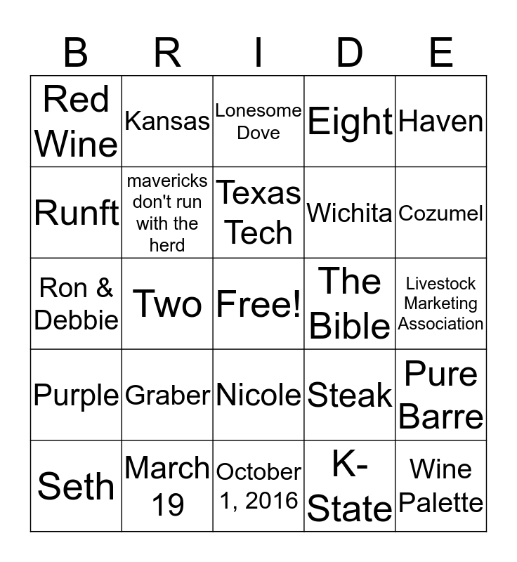 This bingo card has a free space and 24 words: Graber, March 19, Texas Tech, Seth, Haven, Red Wine, Runft, Kansas, The Bible, Nicole, Wichita, Ron & Debbie, Steak, Pure Barre, mavericks don't run with the herd, K-State, Livestock Marketing Association, Lonesome Dove, Cozumel, Two, Wine Palette, Purple, Eight and October 1, 2016.