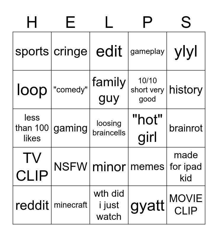 This bingo card has a free space and 24 words: NSFW, minecraft, family guy, reddit, ylyl, sports, loop, cringe, "hot" girl, minor, 10/10 short very good, less than 100 likes, memes, made for ipad kid, "comedy", gyatt, brainrot, edit, history, gaming, MOVIE CLIP, TV CLIP, gameplay and wth did i just watch.
