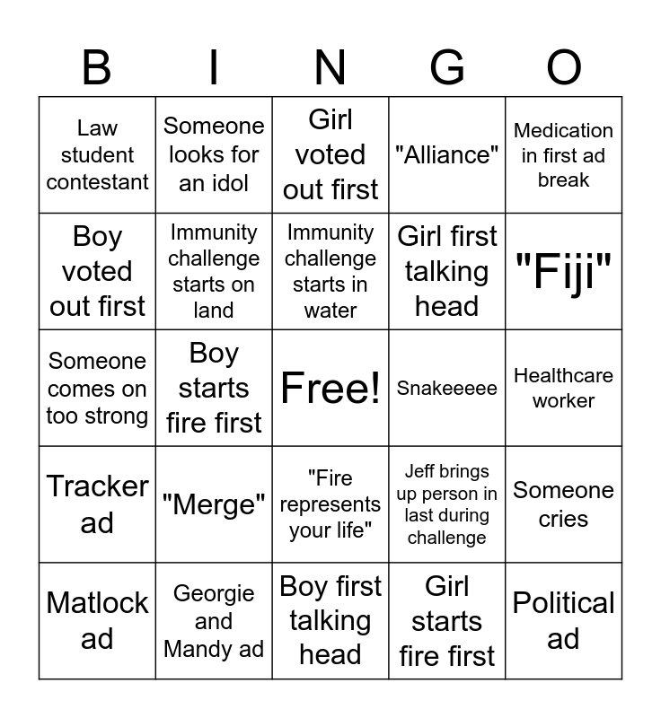 This bingo card has a free space and 27 words: Jeff brings up person in last during challenge, Puzzle pieces in challenge, Girl first talking head, Boy first talking head, Boy voted out first, Girl voted out first, Someone looks for an idol, Tracker ad, Snakeeeee, Someone cries, Someone comes on too strong, "Alliance", Matlock ad, Georgie and Mandy ad, "Fiji", "26 days", Immunity challenge starts on land, Immunity challenge starts in water, "Merge", Law student contestant, Healthcare worker, Girl starts fire first, Boy starts fire first, Political ad, "Fire represents your life", Medication in first ad break and Someone compares themselves to a previous contestant.