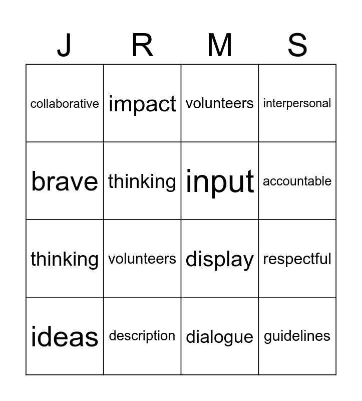 ⚠ This card has duplicate items: explain (2), dialogue (2), instructional (2), collaborative (2), inclusive (2), input (2), self-expression (2), thinking (2), display (2), interpersonal (2), guidelines (2), role-play (2), invention (2), impact (2), topic (2), brave (2), respectful (2), encourage (2), ideas (2), description (2), practice (2), equity (2), volunteers (2), product (2), accountable (2), value (2)