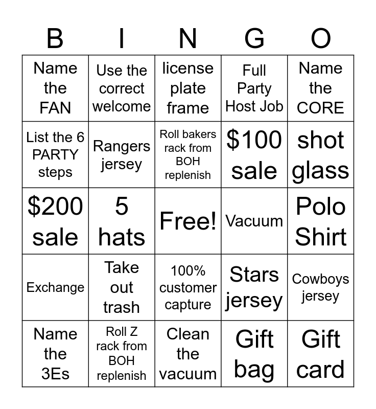 This bingo card has a free space and 24 words: Take out trash, Roll Z rack from BOH replenish, Roll bakers rack from BOH replenish, Name the 3Es, Name the CORE, Name the FAN, List the 6 PARTY steps, Use the correct welcome, Vacuum, 100% customer capture, $100 sale, $200 sale, Stars jersey, Cowboys jersey, Rangers jersey, Gift bag, Polo Shirt, license plate frame, shot glass, 5 hats, Gift card, Exchange, Full Party Host Job and Clean the vacuum.