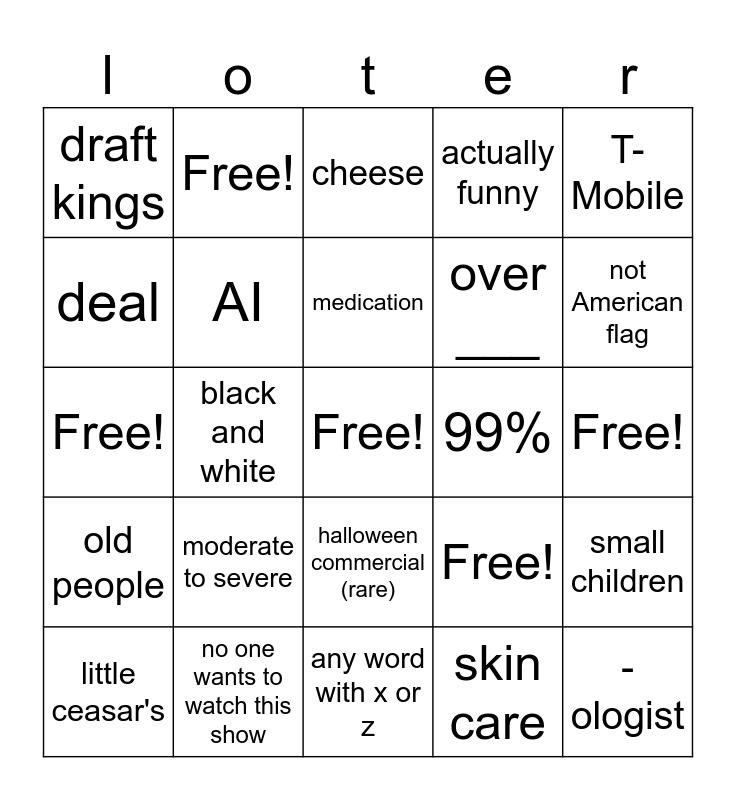 This bingo card has a free space and 24 words: moderate to severe, no one wants to watch this show, medication, little ceasar's, T-Mobile, draft kings, deal, Free!, 99%, halloween commercial (rare), over ___, Free!, Free!, small children, AI, skin care, Free!, cheese, not American flag, black and white, -ologist, old people, actually funny and any word with x or z.