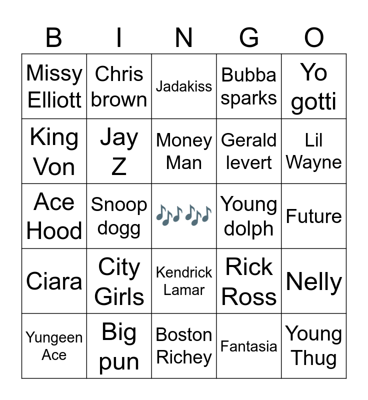 This bingo card has a free space and 52 words: Kodak, Young Thug, NBA young boy, Boston Richey, City Girls, Rod Wave, Chris brown, Lil durk, King Von, 50 Cent, Jay Z, Beyoncé, Nelly, Rick Ross, Trina, Trick daddy, Money Man, Young dolph, Money bagg Yoo, Yo gotti, Snoop dogg, Fantasia, Missy Elliott, Gerald levert, Sisqo, Lauren hill, Kelly price, Juvenile, Lil Wayne, Meg the stallion, Lil bow wow, Bubba sparks, Andrea 3000, Big boi, Polo Da Don, Jadakiss, Big pun, Ludacris, Busts rhymes, J. Cole, Biggie smalls, Future, Ciara, Tupac, Kendrick Lamar, Eminem, YNW Melly, Ace Hood, T-pain, Bobby shmurda, Yungeen Ace and Lucci.