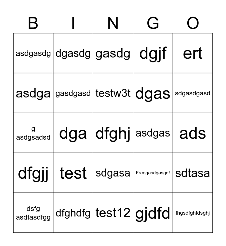 This bingo card has 25 words: test, test12, testw3t, dsfg asdfasdfgg, ert, asdgasdg, asdga, dgasdg, asdgas, sdgasa, dgas, g asdgsadsd, Freegasdgasgd!, sdtasa, gasdgasd, fhgsdfghfdsghj, ads, gasdg, sdgasdgasd, dga, dfghj, dfghdfg, dfgjj, dgjf and gjdfd.