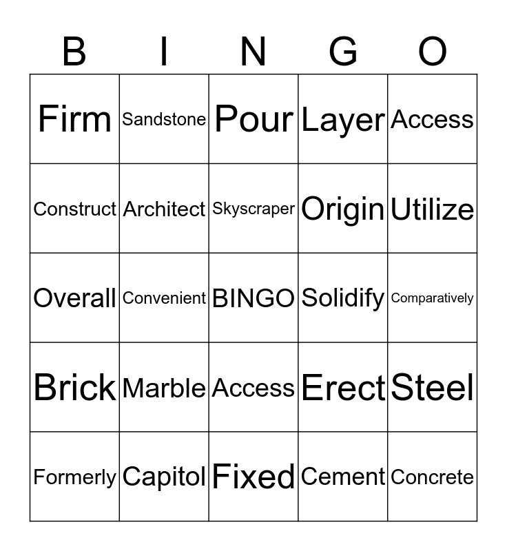 This bingo card has a free space and 24 words: Marble, Capitol, Skyscraper, Formerly, Access, Firm, Construct, Sandstone, Solidify, Access, Origin, Overall, Erect, Steel, Architect, Cement, Comparatively, Pour, Utilize, Convenient, Concrete, Brick, Layer and Fixed.