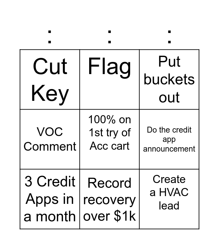 This bingo card has 9 words: 3 Credit Apps in a month, Put buckets out, Flag, VOC Comment, Cut Key, Do the credit app announcement, 100% on 1st try of Acc cart, Create a HVAC lead and Record recovery over $1k.