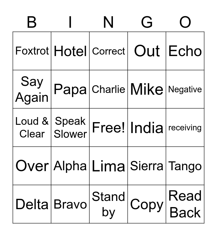 This bingo card has a free space and 24 words: Alpha, Bravo, Charlie, Delta, Echo, Foxtrot, Say Again, Hotel, India, Lima, Mike, Loud & Clear, Sierra, Tango, Papa, Copy, receiving, Correct, Negative, Speak Slower, Read Back, Over, Out and Stand by.