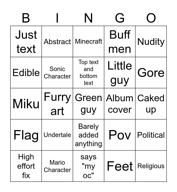This bingo card has 40 words: Fnaf, Miku, Amongus (Free space), Sonic Character, Mario Character, Barely added anything, Top text and bottom text, Comic, Nudity, Flag, Furry art, Buff men, Green guy, Caked up, Album cover, Undertale, Two characters kissing, Just text, Cat, Minecraft, Political, Feet, Little guy, Edible, Yellow triangle (Bill), Spongebob Character, Anime (Styled) Character, Pokemon, Religious, Outer space, Blush, High effort fix, Love heart, Pov, Gore, says "my oc", Gun, Emoji, Abstract and Character Fusion.