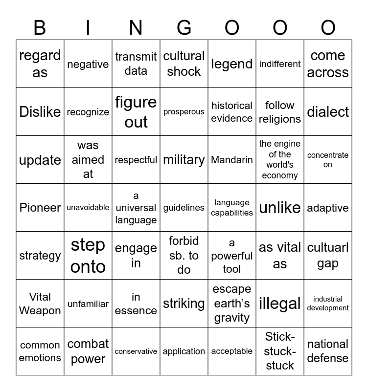 This bingo card has 49 words: illegal, follow religions, acceptable, unavoidable, respectful, adaptive, negative, conservative, indifferent, forbid sb. to do, come across, cultural shock, the engine of the world's economy, Mandarin, unfamiliar, unlike, Dislike, dialect, industrial development, legend, historical evidence, a universal language, regard as, recognize, common emotions, figure out, concentrate on, combat power, military, was aimed at, national defense, language capabilities, Vital Weapon, in essence, Pioneer, a powerful tool, as vital as, cultuarl gap, update, engage in, striking, strategy, guidelines, application, prosperous, transmit data, escape earthβs gravity, step onto and Stick-stuck-stuck.