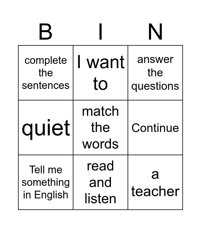 This bingo card has 10 words: read and listen, answer the questions, complete the sentences, match the words, quiet, Tell me something in English, I want to, repeat, Continue and a teacher.