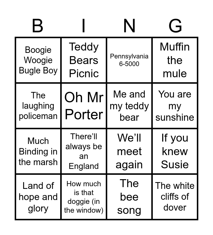This bingo card has 59 words: Free!, Hang out the washing on the Siegfried line, Bless them all, The white cliffs of dover, I taut I taw a puddy tat, Roll out the barrel, Me and my teddy bear, Mairzy Doats (Mares eat oats), Much Binding in the marsh, Sisters, Muffin the mule, We are the Ovaltiny’s, Oh Mr Porter, Knees up mother brown, Swanee, Boogie Woogie Bugle Boy, Land of hope and glory, The laughing policeman, Goodnight sweetheart, You are my sunshine, How much is that doggie (in the window), Pennsylvania 6-5000, Wish me luck, Happy days are here again, Hey little hen, Chattanooga choo choo, Over the rainbow, I’m leaning on a lamppost, There’ll always be an England, A nightingale sang in Berkley Square, I’ve got sixpence, Kiss me goodnight Sergeant major, When the red red robin, When I’m cleaning windows, Teddy Bears Picnic, Don’t sit under the apple tree, Run rabbit run, If you knew Susie, Underneath the Arches, We’ll meet again, Lovely bunch of coconuts, The Hippopotamus song (Mud Mud Glorious Mud), The bee song, Deep in the heart of Texas, I only have eyes for you, The runaway train, In the mood, Lili Marlene, Woody Woodpecker, When Johnny comes marching home, Tulips from Amsterdam, Maybe it’s because I’m a Londoner, Minnie the Mermaid, Love letters straight from your heart, Sway, Don’t fence me in, On the sunny side of the street, Buckingham palace and Riders in the sky.