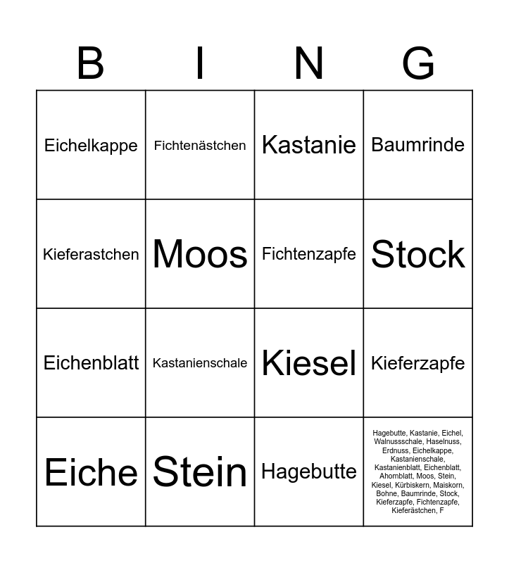 This bingo card has 17 words: Hagebutte, Eiche, Kastanie, Eichelkappe, Kastanienschale, Baumrinde, Kieferzapfe, Fichtenzapfe, Stock, Moos, Stein, Kiesel, Kieferastchen, Fichtenästchen, Eichenblatt, Kastanienblatt and Hagebutte, Kastanie, Eichel, Walnussschale, Haselnuss, Erdnuss, Eichelkappe, Kastanienschale, Kastanienblatt, Eichenblatt, Ahornblatt, Moos, Stein, Kiesel, Kürbiskern, Maiskorn, Bohne, Baumrinde, Stock, Kieferzapfe, Fichtenzapfe, Kieferästchen, F.