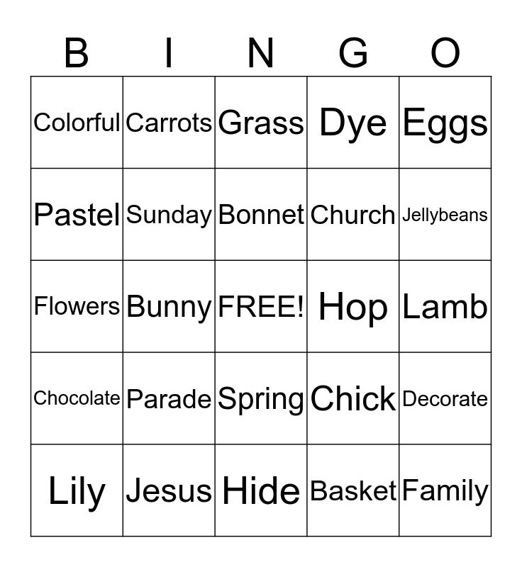 This bingo card has a free space and 24 words: Parade, Jesus, Bonnet, Lily, Eggs, Colorful, Pastel, Carrots, Hop, Spring, Church, Flowers, Chick, Decorate, Sunday, Basket, Lamb, Grass, Jellybeans, Bunny, Family, Chocolate, Dye and Hide.