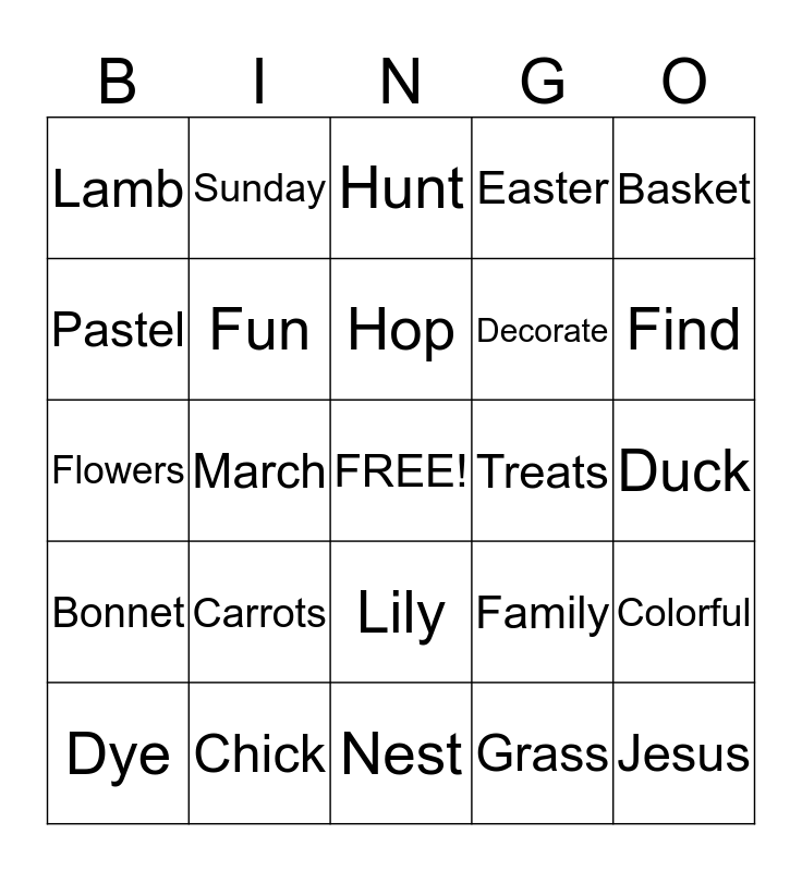 This bingo card has a free space and 24 words: Carrots, Chick, Hop, Dye, Basket, Lamb, Pastel, Sunday, Treats, Lily, Decorate, Flowers, Family, Colorful, Fun, Grass, Duck, Hunt, Find, March, Jesus, Bonnet, Easter and Nest.