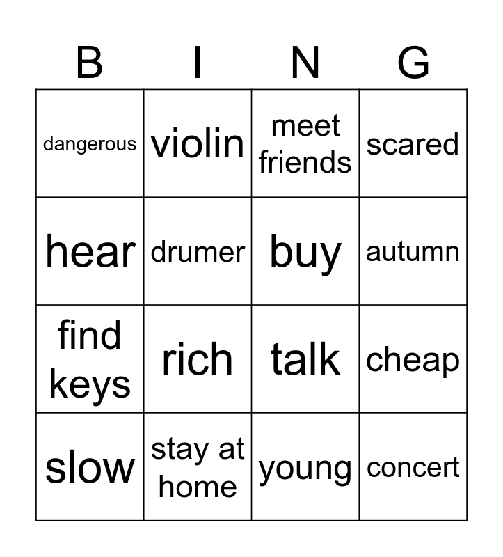 This bingo card has 16 words: stay at home, cheap, meet friends, dangerous, find keys, violin, talk, young, hear, drumer, slow, scared, rich, autumn, buy and concert.
