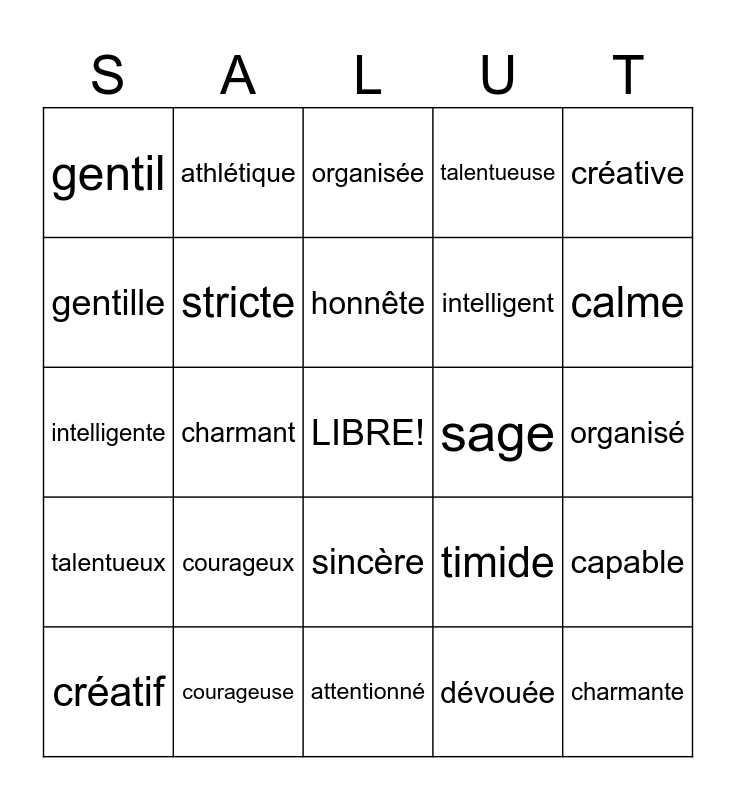 This bingo card has a free space and 24 words: courageux, courageuse, honnête, créatif, créative, gentil, gentille, athlétique, sage, sincère, intelligent, intelligente, timide, capable, stricte, dévouée, organisé, organisée, calme, charmant, charmante, talentueux, talentueuse and attentionné.