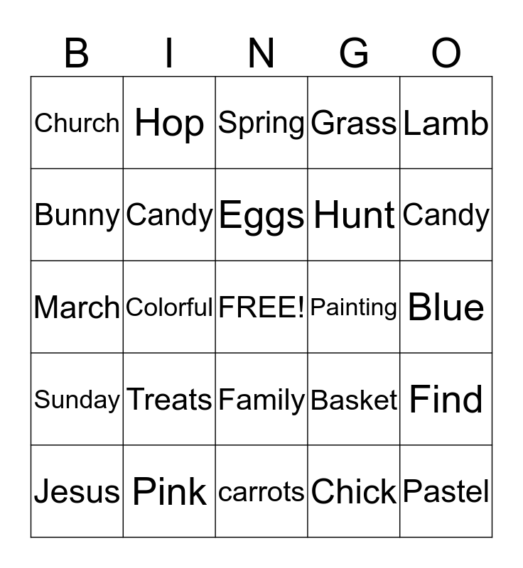 This bingo card has a free space and 24 words: Treats, Pink, Eggs, Jesus, Lamb, Church, Bunny, Hop, Painting, Family, Hunt, March, Basket, Find, Candy, Chick, Blue, Spring, Candy, Colorful, Pastel, Sunday, Grass and carrots.